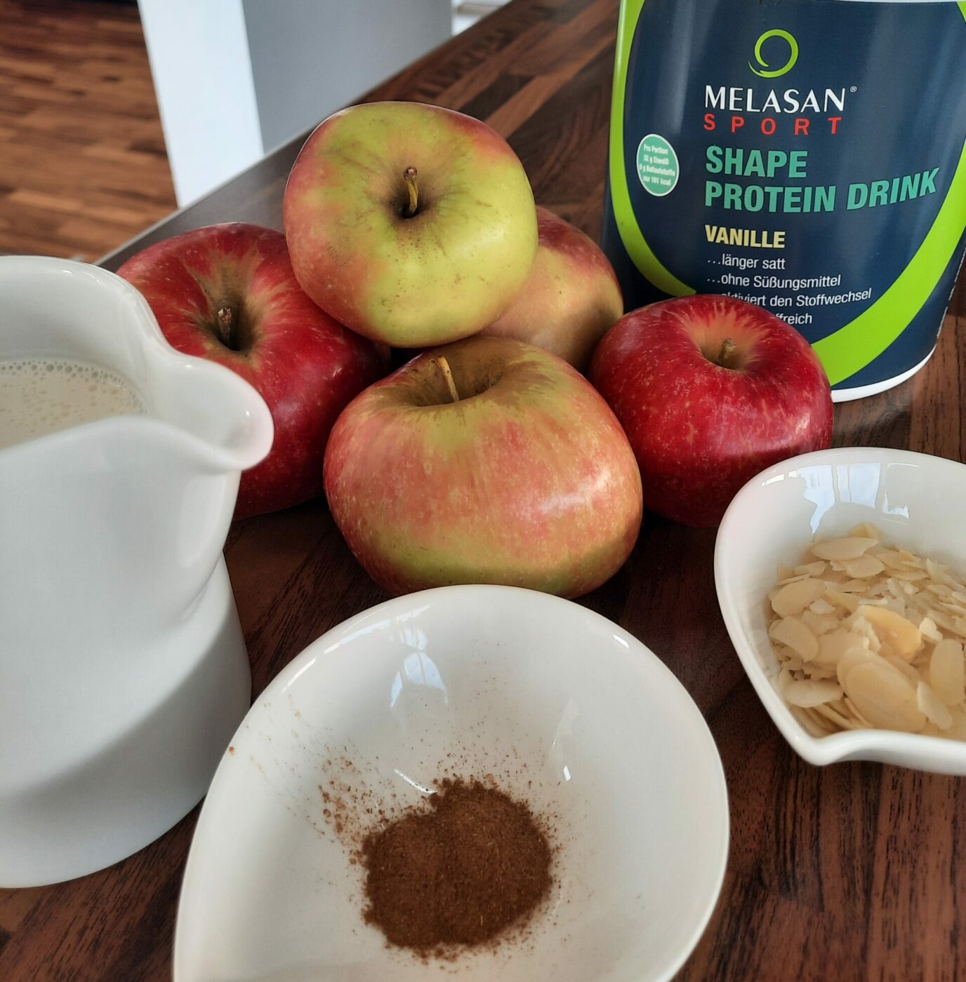 Äpfel schälen, entkernen und in kleine Stücke schneiden. Mit Zimt und Zucker vermengen, mit Wasser bedecken und weichkochen. Anschließend mit dem Mixstab zu Apfelmus pürieren. Das Mus ganz auskühlen lassen. In der Zwischenzeit Cremefine mit dem MELASAN Vanille – Protein – Pulver vermischen und steif schlagen. Das ausgekühlte Apfelmus mit dem steif geschlagenen Cremefine vermengen. Zuletzt in Gläser füllen und mit Zimt und gehobelten Mandeln bestreuen.