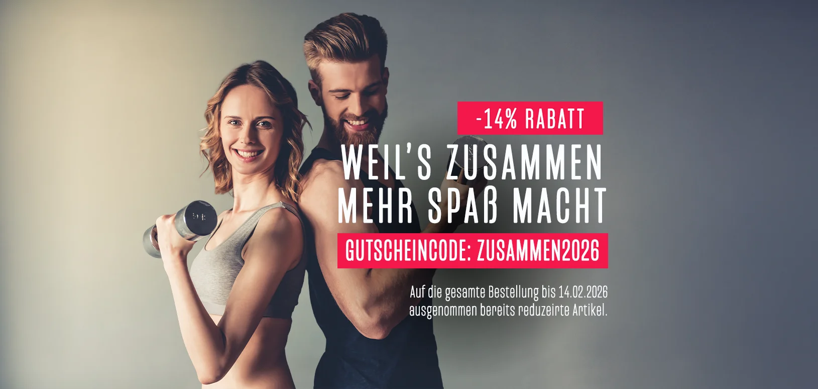Sport ist nicht nur gesund, sondern macht auch Freude. Schenke deshalb als sportliches Geschenk zum Valentinstag dir und deinem Partner oder deiner Partnerin gemeinsame Zeit beim Sport. Bei einer Bestellung bis zum 14.02.2026 erhältst du mit dem Gutscheincode ZUSAMMEN2026 -14% Rabatt auf eine gesamte Bestellung im Melasan Sport Webshop (ausgenommen bereits reduzierte Artikel).